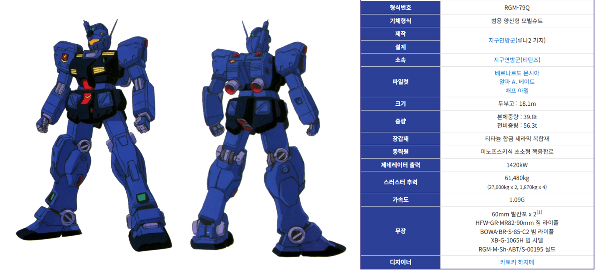 짐 쿠엘(RGM-79Q)은 지구연방군의 양산형 기체인 짐 시리즈의 최종 진화형 중 하나로, 티탄즈에 의해 개량된 전략형 모빌슈트입니다. 특히 무장 구성, 기동 능력, 장갑 성능 면에서 기존 양산기와는 확연히 다른 수준을 보여줍니다. 짐 쿠엘은 건담 시리즈 속 '짐' 계열 기체 중에서도 군사적 전략성과 강력한 성능을 동시에 갖춘 대표적인 중기체로 평가받고 있습니다.본 글에서는 짐 쿠엘의 기체 성능과 무장 특징, 전장 내 활용도 및 팬들의 평가에 이르기까지 깊이 있게 분석해 보겠습니다.짐 쿠엘의 기체 성능 분석짐 쿠엘(RGM-79Q)은 지구연방군의 주력 양산기였던 짐 시리즈의 개량형으로, 티탄즈가 기존 짐의 약점을 보완하고 전투 효율을 극대화하기 위해 개발한 기체입니다. 가장 큰 특징은 ‘성능 균형’에 있습..